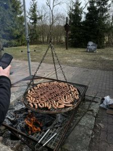 Po zajęciach kynologicznych odbyło się instruktażowe polowanie – oczywiście bez broni. Zademonstrowano sygnały łowieckie, przeprowadzono odprawę i wylosowano kartki stanowiskowe. Po sygnale „Apel na łowy” udano się do lasu, gdzie pokazano sposób rozstawienia myśliwych na stanowiskach. Zwrócono uwagę na „strzał po linii” – odmierzając prawidłowe 10 metrów, odmierzono także 40 metrów jako dopuszczalną granicę strzału w miot i 100 metrów do podkładaczy z psami – ograniczające w lesie oddanie strzału w tym kierunku. Po odbytym polowaniu udano się na miejsce zbiórki i zakończono polowanie omówieniem sposobu organizacji pokotu. Zajęcia zakończyło ognisko z pieczonymi kiełbaskami – wzorowo przygotowane przez starostę kursu.