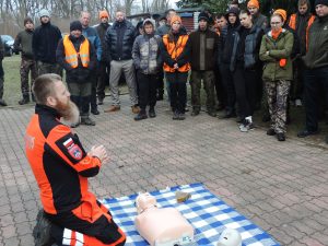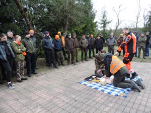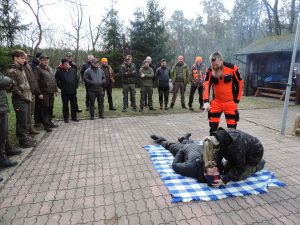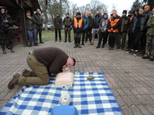 Słuchacze kursu dla kandydatów do PZŁ organizowanego przez ZO w Koninie – w minioną niedzielę wyjechali w teren. Swoją siedzibę w kazimierskich lasach udostępniło koło „Drop” . Szkolenie rozpoczęto od udzielania pierwszej pomocy przedmedycznej, które przeprowadził wykwalifikowany wykładowca realizujący szkolenia dla wojska i służb mundurowych. Dowiedzieliśmy się jak ratować życie ludzkie w przypadku zatrzymania oddechu oraz utraty przytomności. Poznaliśmy podstawy resuscytacji krążeniowo – oddechowej ćwicząc na fantomach oraz różne scenariusze sytuacji zagrożenia życia z wykorzystaniem przenośnego automatycznego defibrylatora zewnętrznego AED. Uczyliśmy się, jak szybko reagować poprzez tamowanie krwotoków i zaopatrywanie ran.